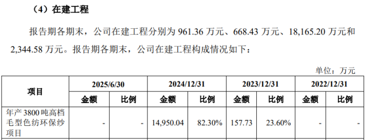 另据招股书第268页披露,公司“年产3800吨高档毛型色纺环保纱项目”已于2025年6月建成并开始批量生产纱线。与此同时,招股书披露的在建工程相关信息显示,该项目对应的在建工程,截至2025年6月末,已经全部结转为固定资产,指向该项目已经验收完工并投入生产。