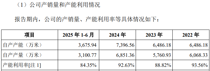 但从数据来看,公司在今年上半年产能利用率为84.35%,较2024年的92.63%明显下降,且为近年来的最低数值;同时今年上半年订单规模为0.44亿米,而2024年全年为1亿米;还有招股书披露的产能利用率数据显示,福恩股份今年上半年的产能为3675.94万米,折算全年为7351.88万米,相比2024年度全年产能7396.56万米还略有下降,这都与公司在信披文件中的描述存在矛盾。