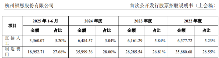 值得关注的是,近年来福恩股份的生产人员人数持续增长,2022年到2025年上半年分别为624人、646人、749人和926人,其中2025年上半年生产人员人数相比上年末增长了20%以上,但同期产能、产量均未出现增长。还有2024年生产人员人数相比2022年增长了20%,而2024年主营业务成本中的直接人工成本为6484.57万元,相比2022年的6577.72万元不增反降。