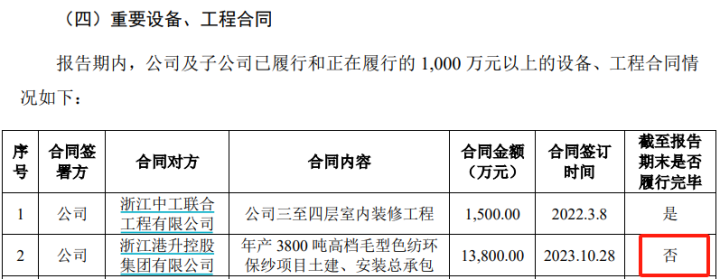 但与此同时,招股书第307页披露的“公司及子公司已履行和正在履行的1000万元以上的设备、工程合同情况”显示,针对该项目的总承包合同,截至目前仍未履行完毕。