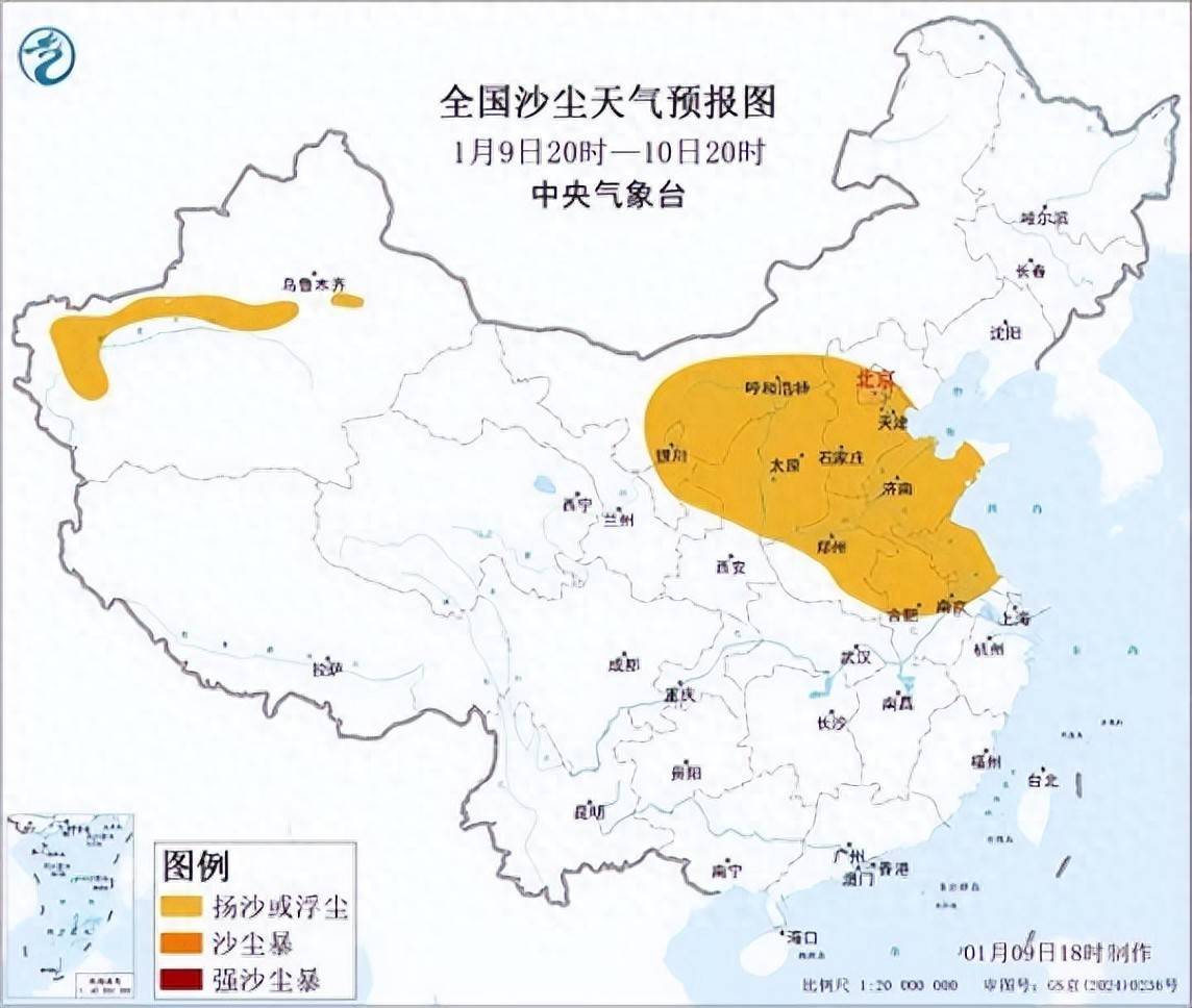 1月9日20时至1月10日20时全国沙尘天气预报图。中央气象台 图